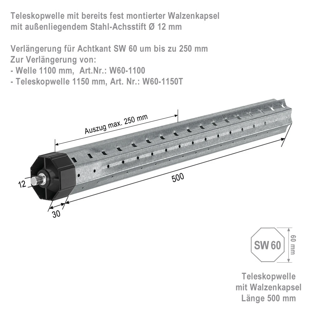 Teleskopwelle SW 60, Länge 500 mm, aus feuerverzinktem Stahl, für Achtkantwelle SW 60, montiert mit Walzenkapsel